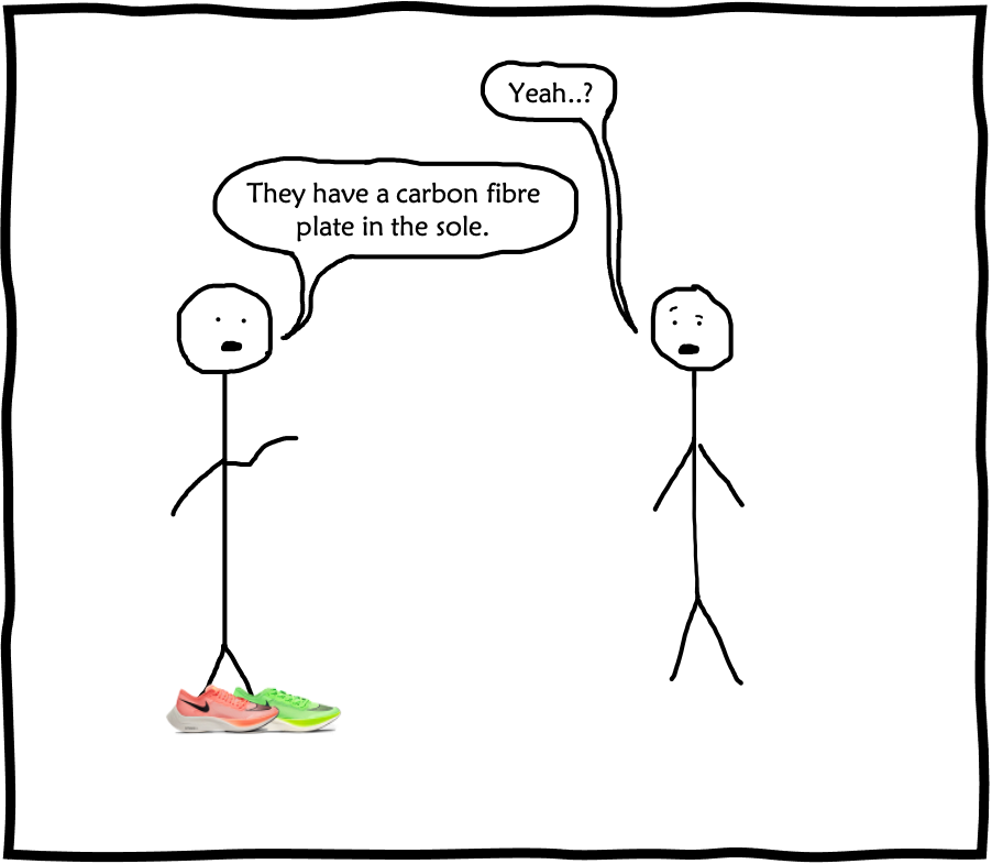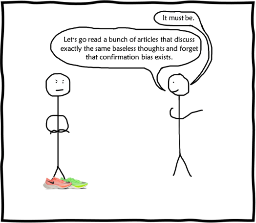When the shoes were first released, the carbon plate was the hot discussion topic in every article. When you think of the components necessary in a running shoe, a carbon plate is typically not one of them. I think this is what caused people to start speculating so violently. I’m assuming the conversations and thought processes went something like this…