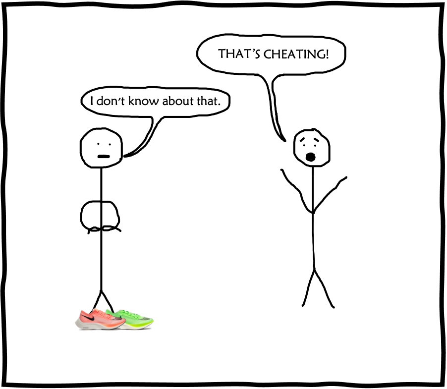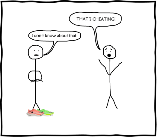 Not exactly. In reality, whilst using the shoes should not provoke cries of cheating, the existence of them creates a number of potential issues. Ones that can’t really be argued with facts and lab studies, but are more based on opinion. For example, athletes sponsored by shoe brands other than Nike, suddenly found themselves at a distinct disadvantage. Whilst use of the Vaporflys should not be considered cheating, where do you draw the line before the competition becomes irrelevant? How does this situation compare to the Speedo LZR swimsuits that were banned by FINA in 2009?